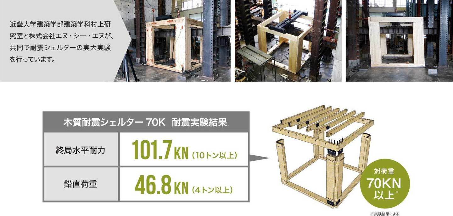 「木質耐震シェルター 70K」は、木造ラーメンフレームによるシェルターであり、耐震構法SE構法の構造技術を用いた製品です。この技術を持つ株式会社エヌ・シー・エヌによる技術開発、部材供給、サポートを得て、一般社団法人耐震住宅100%実行委員会(本法人)が販売いたします。